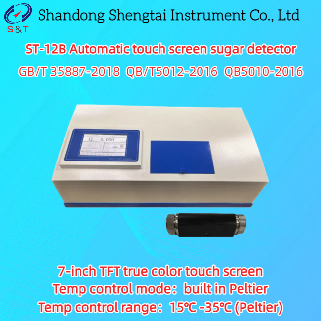 El detector automático de azúcar con pantalla táctil ST-12B es un instrumento para medir la rotación óptica de sustancias. La concentración, pureza, contenido de azúcar o contenido de la muestra se pueden determinar midiendo la rotación óptica de la muestra. Se utiliza ampliamente en la fabricación de azúcar, productos farmacéuticos, petróleo, alimentos, productos químicos y otros sectores industriales, así como en colegios y universidades relevantes e instituciones de investigación científica, y cumple con el método de prueba GB/T 35887-2018 para azúcar granulada blanca, el método de prueba QB/T 5012-2016 para azúcar blanca y el método de prueba QB5010-2016 para azúcar roca.