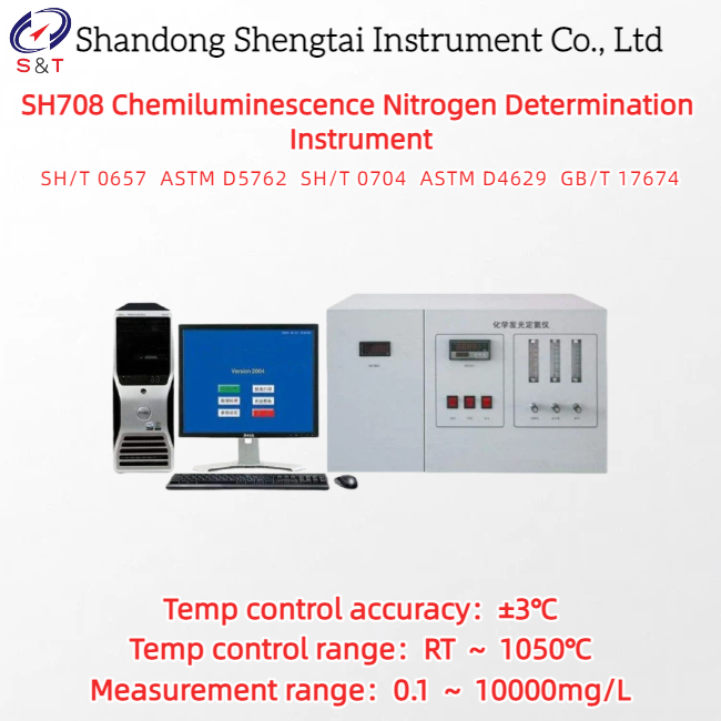 El analizador de nitrógeno por quimioluminiscencia SH708 utiliza el método de quimioluminiscencia para determinar el contenido total de nitrógeno, lo que mejora la capacidad de resistir la interferencia de impurezas y evita la engorrosa operación de la celda de titulación causada por el método coulométrico y los factores inestables resultantes, mejorando en gran medida la sensibilidad del instrumento. Los componentes clave del sistema utilizan componentes importados, lo que garantiza un rendimiento fiable de toda la máquina. Aplicable a la determinación del contenido total de nitrógeno en aceite de parafina, diésel, gasolina, aceite lubricante, fuel oil, gas licuado y gas natural, así como en otros productos derivados del petróleo, materias primas químicas y productos terminados, de acuerdo con la norma SH/T 0657 Determinación de nitrógeno traza en hidrocarburos líquidos de petróleo (Método de combustión oxidativa y quimioluminiscencia, ASTM D5762-2017, SH/T 0704, ASTM D4629, GB/T 17674 Determinación del contenido de nitrógeno en petróleo crudo por el método de inyección en bote y quimioluminiscencia).