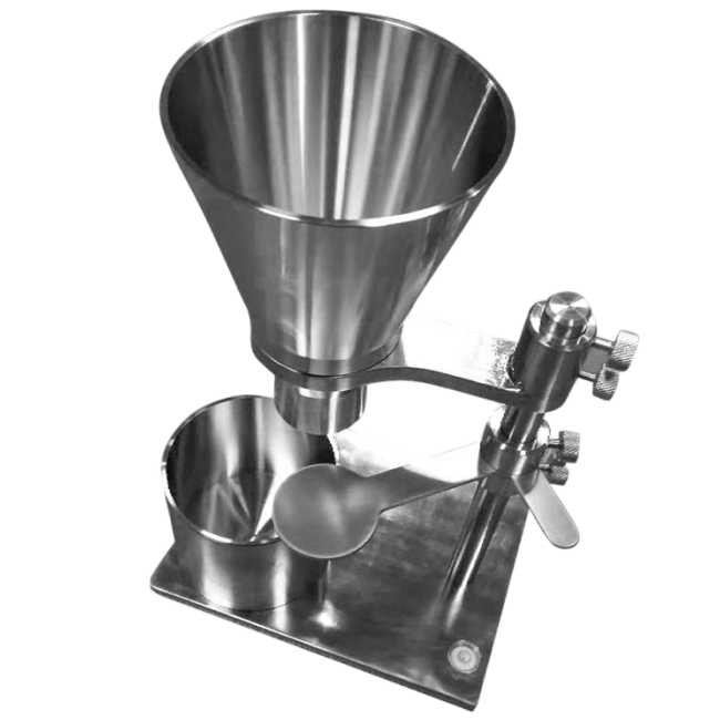 Se pasa una cierta cantidad de muestra a través de un embudo cónico y entra en un recipiente cilíndrico de volumen conocido para determinar la masa de la muestra requerida para llenar el recipiente.