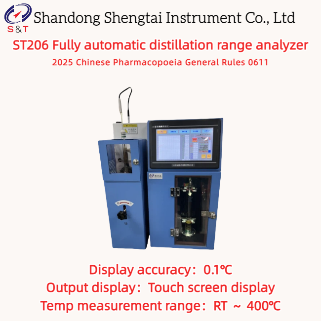 El analizador de rango de destilación totalmente automático ST206 cuenta con una pantalla LCD a color, menú chino de diálogo hombre-máquina, operación guiada y proceso de medición totalmente automatizado.Diseñado de acuerdo con los requisitos de la regla general 0611 de la Farmacopea china de 2025 para el método de determinación del rango de destilación, el intervalo de destilación se refiere al intervalo de temperatura de un líquido destilado según el método siguiente, calibrado a presión atmosférica estándar [101,3 kPa (760 mmHg) ],desde el comienzo de la destilación de la quinta gota hasta que se destilen sólo 3-4 ml o una cierta proporción del volumen de la muestra de ensayo..