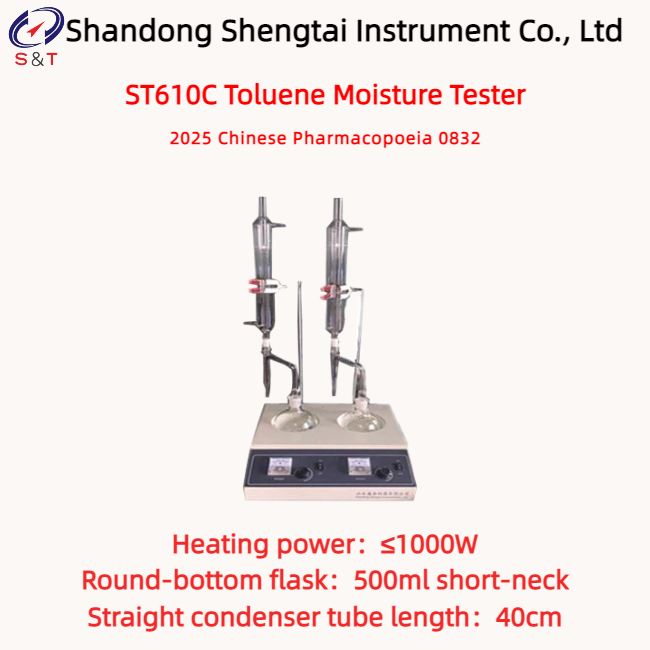 The ST610C Toluene Method Moisture Tester is designed and manufactured in accordahe technical requirements and relevant regulations of Method IV (Toluene Method) in the 2025 Pharmacopoeia, Method 0832, Moisture Dtermination. It is primarily suitable for moisture determination of materials such as traditional Chinese medicinal materials and preparations.